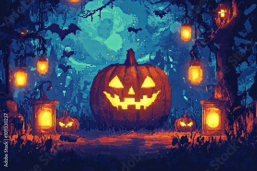 pixel, pumpkin, lantern, playful, art, design, halloween, glowing, night, smile, holiday, skittish, simplistic, vibrant, shape, autumn, horror, colours, dark, fun, atmosphere, celebration, scarey, v, ar, evil, job, id, fear, background, orange, black, forest, symbol, october, season, creepy, mystery, jack, light, ghost, carved, head, jack-o-lantern, tree, decoration, wooden