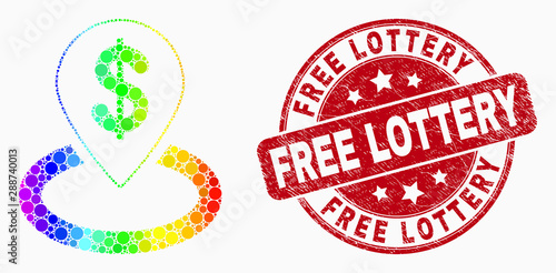 Pixel rainbow gradiented bank location mosaic pictogram and Free Lottery seal. Red vector round scratched seal stamp with Free Lottery title. Vector combination in flat style.