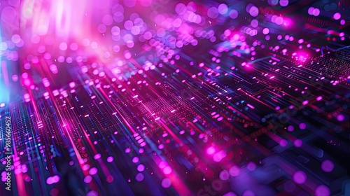 Pixelated circuitry over a pink and violet neon backdrop with glitch effects and light streaks