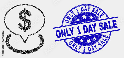 Pixelated dollar placement mosaic icon and Only 1 Day Sale stamp. Blue vector rounded distress stamp with Only 1 Day Sale title. Vector collage in flat style.