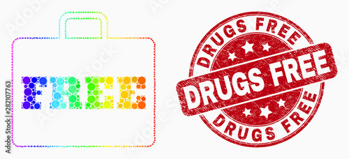 Pixelated spectrum free case mosaic icon and Drugs Free stamp. Red vector rounded scratched stamp with Drugs Free phrase. Vector composition in flat style.