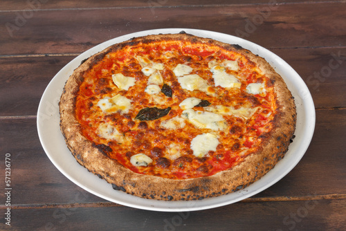 Pizza quatre fromages fait maison sur une table en bois. Gros plan.