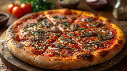 Pizza with mushrooms, tomatoes, and onions on a wooden table