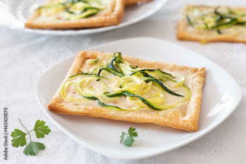 Pizza with zucchini and vegetable cheese. Vegan appetizer