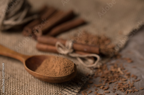Placer crushed cinnamon in a wooden spoon and cinnamon sticks on a textured background with textiles under the burlap.