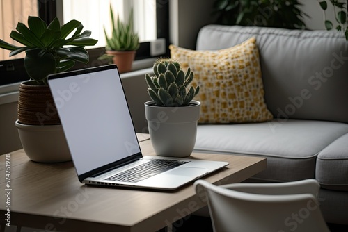 Placing a laptop with a white blank screen, a potted plant, a notebook, and a pencil on a modern table with a nice living room in the background. Generative AI