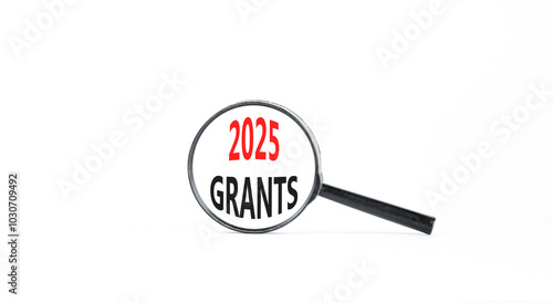 Planning 2025 grants new year symbol. Concept words 2025 Grants on beautiful white paper in magnifying glass. Beautiful white paper background. Business 2025 grants new year concept. Copy space.