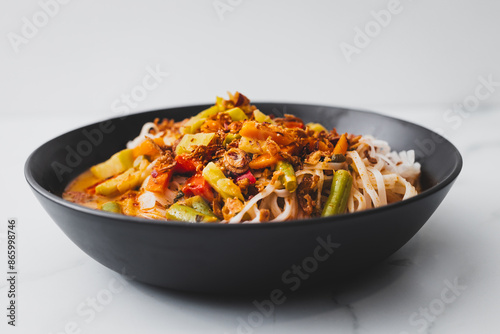 plant-based dan dan rice noodles soup with mixed vegetables and spicy sauce