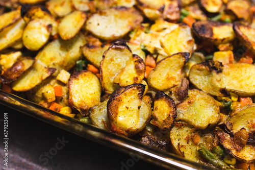 plant-based food, vegan potato bake with garden vegetables and nutritional yeast sauce