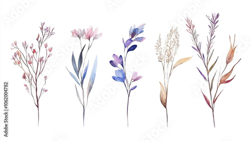 Plants and flowers in a isolated white background, Watercolor wildflowers and leaves illustration set, Illustration of watercolor flowers. Manufactured composition. Set of watercolor elements.