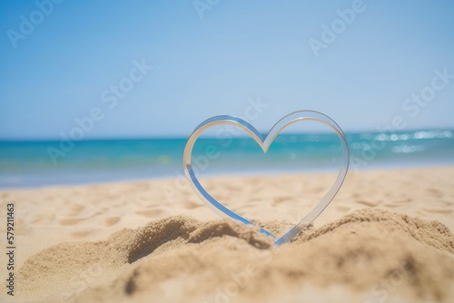 Plastic heart shape on the beach, image for Valentine love or summer vacation concept