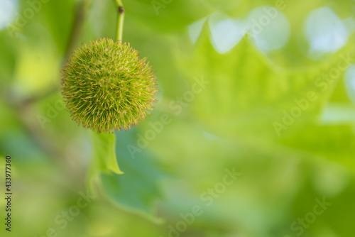 plane, fruit, broadleaf tree, tree, leaf, spiny, sphere, hanging, green, abstract, detail, bokeh