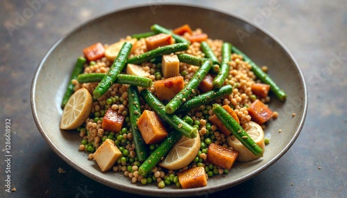 couscous, green, bean, carrot, tofu, lemon, plate, vegetable, still, life, food, realistic, orange, fruit, healthy, dinner, lunch, meal