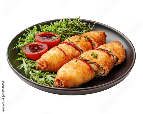 egg, crispy, plate, greener, dipping, sauce, fried, savoury, delicious, food, cookery, snack, dish, meal, epicure, herb, arugula, tomatoes, garnish, culinary, tasty, gold, brown, texture, filling, pastry, rolled, stuffed, fresh, lettuce, black, serving, presentation, isolated, transparency, background, closeup, homemade, eatery, finger, party, platter, cooked, baked, crunchy