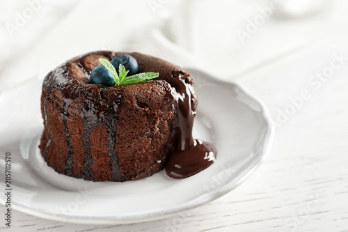 Plate of delicious fresh fondant with hot chocolate and blueberries on table. Lava cake recipe