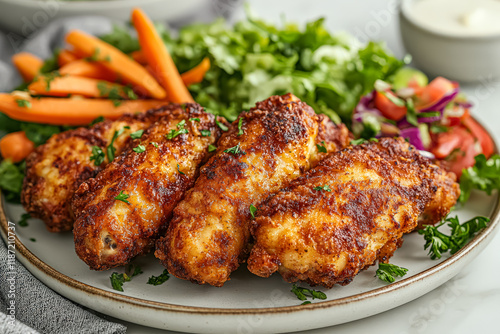 Plate of fried chicken with a side of vegetables. The chicken is golden brown and the vegetables are fresh and colorful. The plate is set on a table and the overall mood of the image is inviting