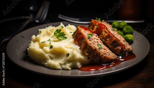 Plate of Mashed Potatoes and Meatloaf With Gravy