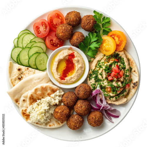 Plate of Mezze with Hummus Falafels and Pita Bead top view isolated on transparent white background, clipping path