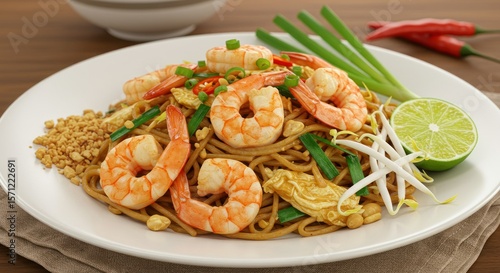 shrimp, noodle, pad, thai, food, asian, plate, delicious, spicey, sauce, vegetable, protein, healthy, meal, dinner, lunch, eatery, cookery, garlic, chilies, lime, peanut, tasty, dish, fresh, cooked, brown, white, sprinkled, onion, green, egg, closeup, mealtime, prepared, appetising, savoury, traditional, dining