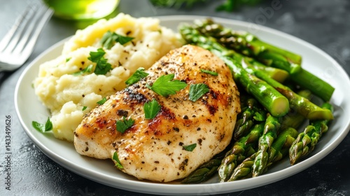 Plate shows perfectly grilled chicken breast accompanied by creamy mashed potatoes and vibrant asparagus.