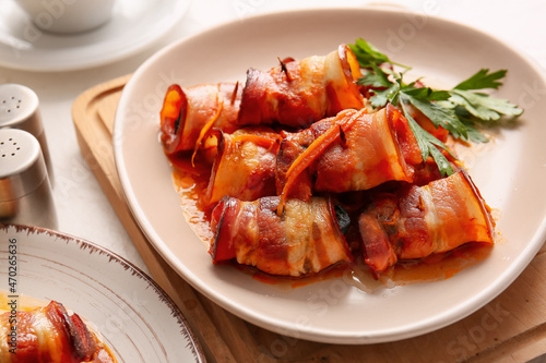 Plate with delicious prunes baked in crispy bacon and gravy on wooden board, closeup