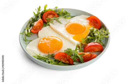 Plate with tasty fried eggs, tomatoes and arugula on white background
