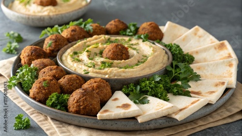 Platter of Middle Eastern Falafel with Hummus and Pita Bread
