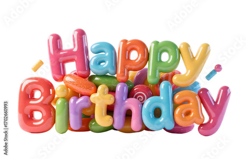 happy birthday, birthday, celebration, festive, party, invitation, card, greeting card, design, graphic design, typography, lettering, font, three-dimensional, colourful, candy, shape, glossy, texture, semitransparent, primary colours, vibrant, cheerful, joyful, fun, playful, mood, atmosphere, imagery, event, marketing, branding, element, decoration, modern, style, digital artwork, theme, concept, copy space, background, template, reflective
