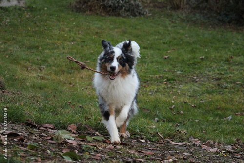 playful australian shepherd blue merle running in the green autumn garden with a toy