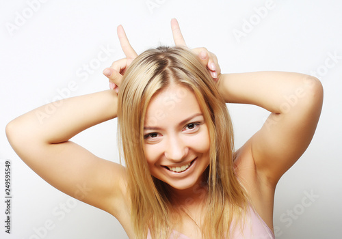 attractive, beautiful, blond, caucasian, cheerful, colours, cute, emotion, expression, expressive, female, figure, finger, flirt, coquetry, fun, gesture, happiness, happy, horn, lady, laughing, look, natural, person, play, playful, portrait, positive, pretty, sitting, smile, student, white, woman, teenage, young