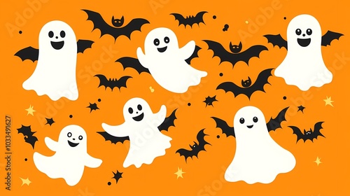 Playful cartoon ghosts and bats on a vibrant orange background.