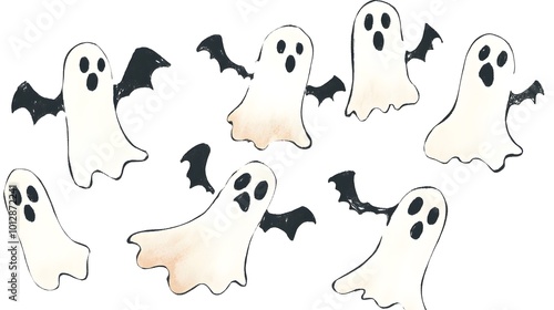 Playful cartoon ghosts with bat wings in a whimsical Halloween design.