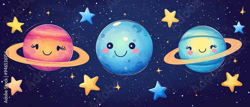 Playful cartoonish vector of happy planets and stars, cute expressions, bright colors, perfect for spacethemed children s decor