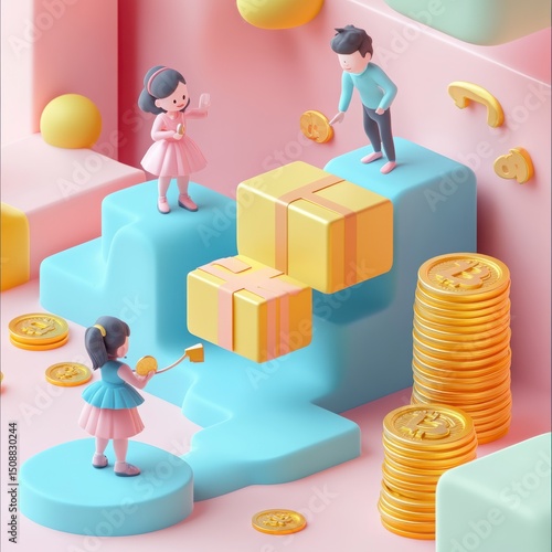 children, minimalist, wealth, distribution, finance, crypto, gift, present, stack, coin, gold, yellow, pink, blue, geometric, shape, cartoon, character, girl, boy, box, ribbon, playful, fun, pastel, colours, cute, friendly, approachable, modern, digital, art, illustration, three-dimensional, render
