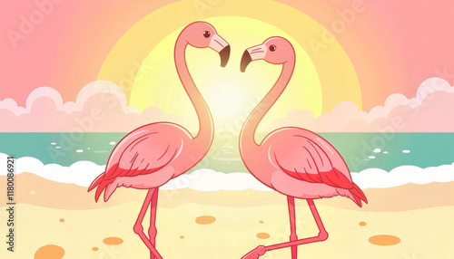flamingo, dance, sunset, beach, love, romance, tropical, pink, couple, cartoon, ocean, wave, soft light, silhouette, artistic, playful, vibrant, joyful, affection, serenity, harmony, warmth, 2, bird, expressive, summer, beautiful, tropical paradise, landscape, romantic, closeup, togetherness, elegance, gentle, reddening, high-coloured, calmness, celebration, enchanting, happiness, no people, evening, symbol, graceful, intertwined, symbolism