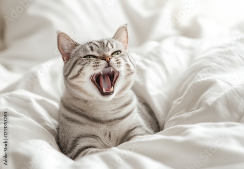 Playful Gray Cat Yawning Comfortably on Soft White Bedding in Bright Room Light Captured in a Cozy Indoor Setting for Cat Lovers and Pet Enthusiasts