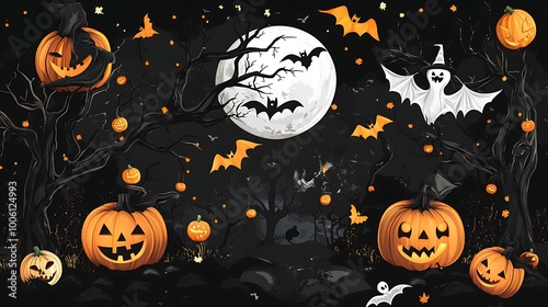 Playful Halloween design featuring spooky bats, pumpkins, and witches' hats on a black background