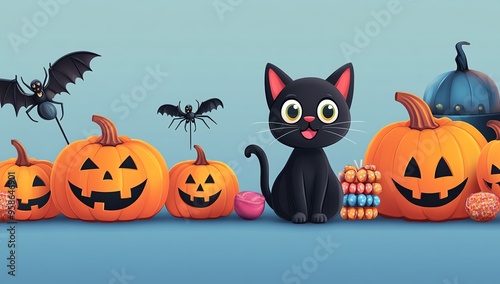 Playful Halloween scene featuring a cute black cat, smiling pumpkins, and whimsical bats, perfect for festive decorations.