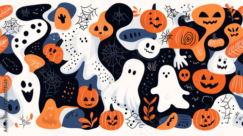 Playful Halloween-themed illustration featuring ghosts, jack-o'-lanterns, spider webs, and abstract shapes in a color palette of orange, black, and white.