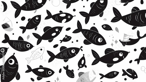 fish, underwater, illustration, cartoon, playful, aquatic, marin, pattern, black, white, swimming, sea, ocean, nature, wildlife, design, art, vector, fun, background, creative, graphic, whimsical, colourful, marine animal, ocean life, cute, happy, marine life, decorative, seamless, vibrant, lively, artistic, joyful, unique, imaginative, cheerful, oceanic
