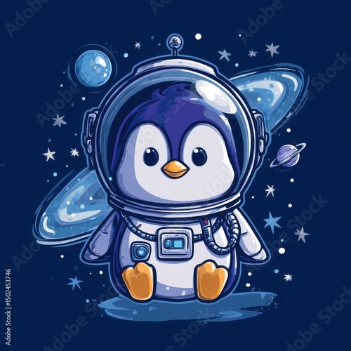 mascot, humor, cosmic, planet, playful, star, exploration, helmet, silver, floating, adorable, silly, whimsical, astronaut, galactic, ice, penguin, tiny, fun, icy, illustration, cartoon, oversize, space, character, cute, blue, cheerful, design