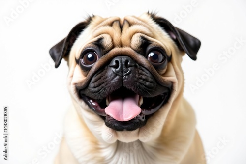 Playful pug, isolated on white backdrop Happy expression , sweet, front view, animal photography