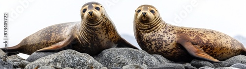 Playful Seals on Rocky Coast, full-body portrait of seals lounging on sunlit rocks, serene atmosphere, soft colors, evokes tranquility and the beauty of wildlife in nature.