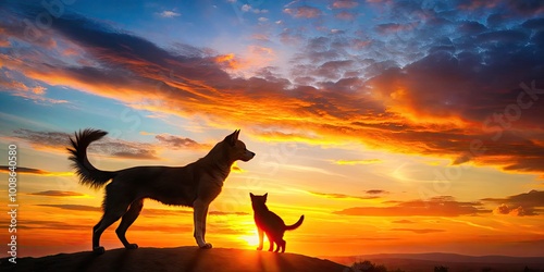 cat, dog, silhouette, pet, animal, sunset, together, friendship, playful, nature, sky, outline, black, furry, companionship, love, horizon, scene, calmness, warm colors, evening, graphic, illustration, harmony, peaceful, shadow, sun, whimsical, graphic design
