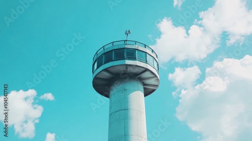 tower, cloud, sky, blue, space, architecture, structure, observation, location, landmark, travel, sunny, minimal, skyward, round, concrete, design, viewpoint, scenery, summer, daylight, height, modern, perspective, scenic, nature, bright, colourful, environment