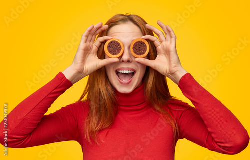 woman, playful, cookie, happy, pretend, food, fun, young, holding, biscuit, joyful, sugar, attractive, fresh, positive, round, surprise, content, redhead, casual attire, ginger, modern, girl, emotion, style, female, natural, bright, expression, cheerful, face, teenage, vibrant, hide, smile, beautiful, culture, orange background, enjoyment