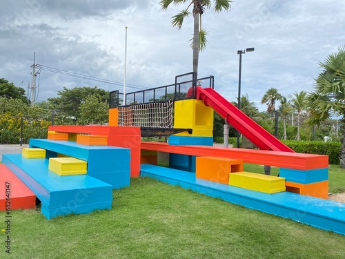 playground, park, fun, children, play, children, childhood, summer, outdoors, colourful, slide, swing, toy, plastic, red, grass, blue, equipment, beach, empty, children, colours, sand, recreation