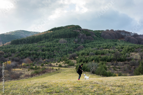 young, white, weather, together, terrier, sunglasses, puppy, playing, play, man, hipster, hill, green, gent, game, fun, friends, dog, cloudy, caucasian, bull terrier, brunette, breed, adult