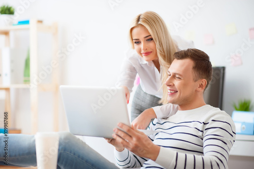 man, guy, talk, photogenic, woman, pleasant, colleague, smile, tablet, table, always, connected, closeup, several, to sit, show, office, indoor, contemporary, gesture, together, life, work, modern, person, look, white, digital, shirt, hand, striped, female, people, technology, togetherness, workplace, thought, style, daytime, screen, concept, surface, device, stationary, colours, communication, stylish, brunette, tied-up