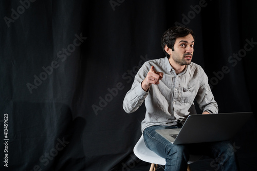 Pleasant positive business man using laptop.Happy smiling man in shirt works on laptop on a dark background